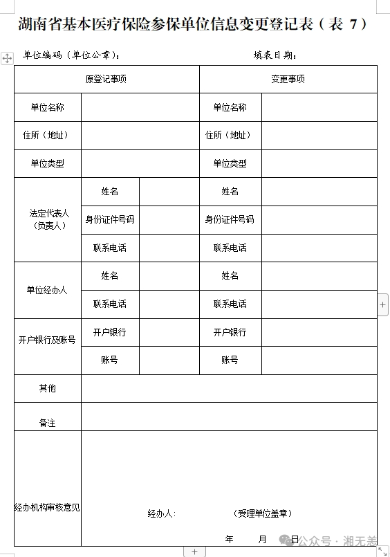 《湖南省基本医疗保险参保单位信息变更登记表》(加盖单位公章;表格样式附后,点击左下角“阅读原文”可在文末下载电子版)