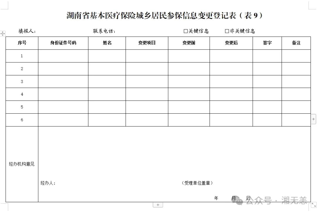 前期,“湘无恙”公众号《湖南省医疗保障经办政务服务事项办事指南(2025年版)》,已推送13项政务服务的详细信息。 今天推送第14项:“城乡居民参保信息变更登记”的相关内容,并特别标注与2023年版不同的内容。欢迎收藏和转发。 “城乡居民参保信息变更登记”指南 01 事项名称 城乡居民参保信息变更登记。 02 受理单位 乡镇人民政府(街道)、村(社区)。 03 服务对象 除职工基本医疗保险应参保人员以及按国家规定享有其他保障的人员以外,其他所有城乡居民均属居民医保制度覆盖范围。具体包括农村居民、城镇非从业居民,在校学生及学龄前儿童,社区矫正对象,在我省居住且办理了居住证的未就业港澳台居民,在我省就读的港澳台大学生、外国国籍留学生,在我省永久居留的未就业的外国人,国家规定的其他人员。 04 办理渠道 (1)现场办理:各统筹区医保经办机构公布的经办服务大厅办理地址、各乡镇(街道)政务服务大厅、各村(社区)便民服务中心。 (2)线上办理:各统筹区医保经办机构向社会公布的网站、湖南省医疗保障网上服务大厅、湖南省政务服务平台等。 05 办理流程 (1)申请。参保人员向乡镇(街道)政务服务大厅、各村(社区)便民服务中心提交信息变更材料,申请办理居民参保信息变更登记。 (2)受理。相关工作人员受理申请人提交的申请材料,确认其是否属于受理范围、材料是否齐全。属于受理范围且材料齐全的当场受理,材料不全的一次性告知需补齐的材料并重新提交;不予受理的应告知理由。 (3)审核。审核通过的予以登记,审核不通过的将原因告知申请人。 (4)办结。 06 办理材料 (1)医保码(电子凭证)或有效身份证件或社保卡; (2)《湖南省基本医疗保险城乡居民参保信息变更登记表》(表格样式附后,点击左下角“阅读原文”可在文末下载电子版) 备注:变更姓名、性别、身份证号、出生日期等关键信息的,应提供必要的佐证材料。 07 办理时限 即时办结。 08 查询方式 现场查询、线上查询(各统筹区医保经办机构公布的电话、门户网站、手机APP或微信公众号等)。 09 监督电话 各统筹区医保经办机构向社会公布的监督电话。 10 评价渠道 现场评价、线上评价、第三方评价等,并向社会公布。评价内容主要包括信息公开、办事效率、依法依规办理等。 湖南省基本医疗保险城乡居民 参保信息变更登记表