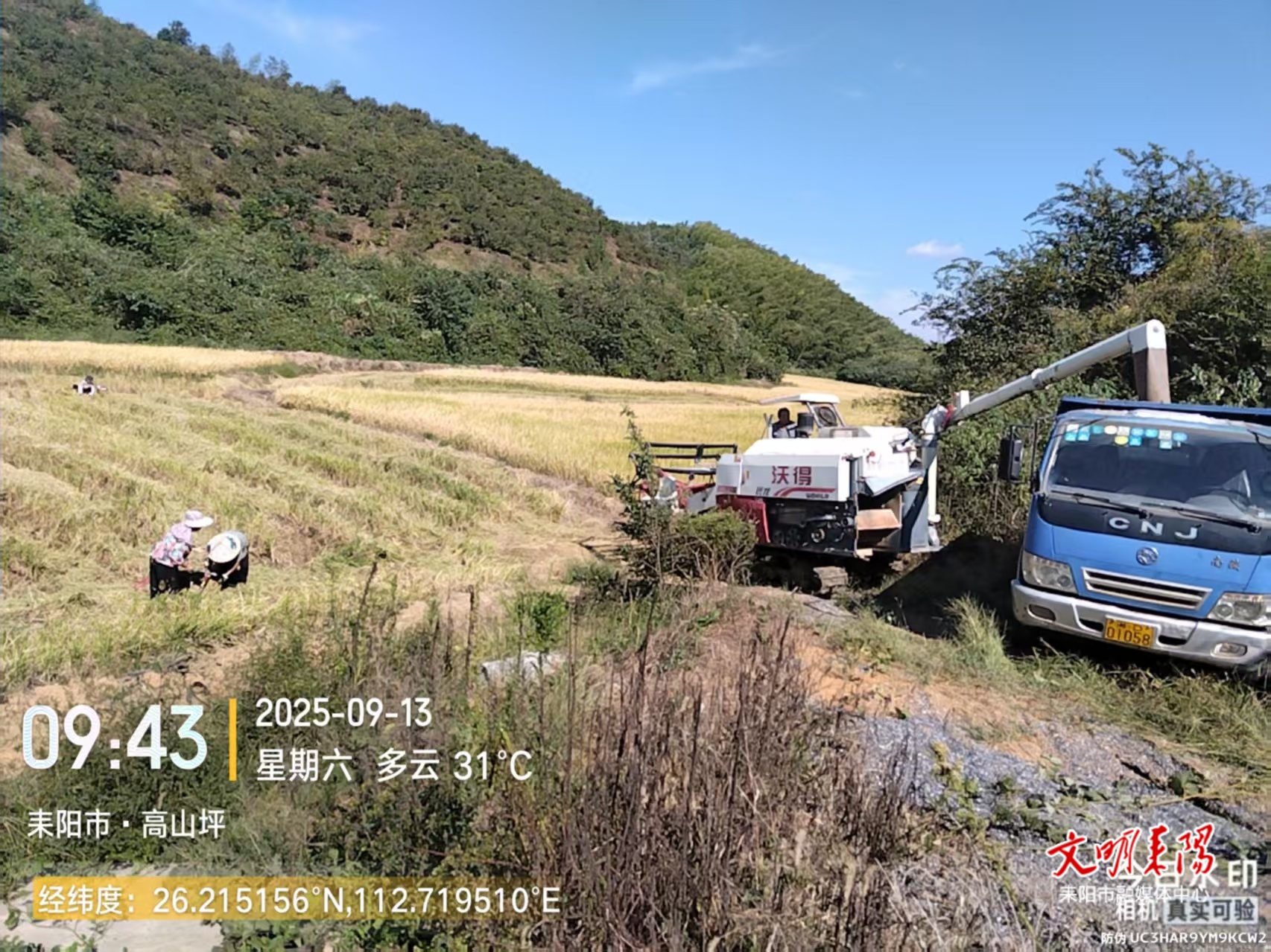秋收时节,稻田里一台大型收割机正忙碌穿梭,农机手熟练操作设备,所到之处,稻穗被迅速卷入机器,切割、脱粒、吐杆等工序一气呵成,金黄稻谷源源不断流入收割机储存仓,随后被转运至运粮车上,整个收割过程高效有序。在长坪乡党委的支持和协调下,耒阳市正源学校向大元村捐赠旋耕机、收割机各一台,供该村及周边村粮食生产使用,相较传统人工收割,作业效率大幅提升。