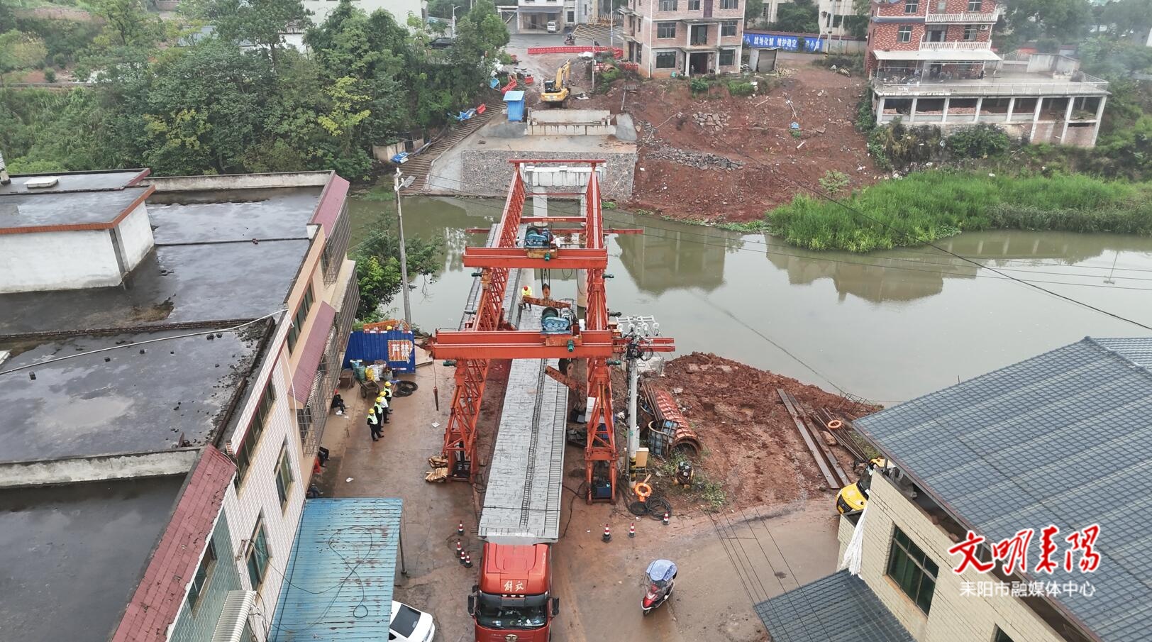 耒阳融媒9月27日讯(记者 梁梓坤 刘喜)9月26日早上6时30分,大市镇Y426乡道K19+524桩号的敖河桥施工现场,记者看到首片箱梁稳稳落位,桥梁重建正式进入梁体连接阶段。当日计划完成第三跨三片箱梁的吊装,总计九片箱梁预计三天即可全部完成,标志着工程建设取得新进展。