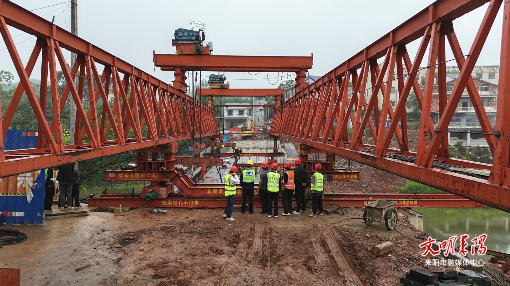 施工现场一派繁忙景象。120吨架桥机缓缓运转,箱梁依次吊装到位,工人们在桥面、桥下、吊机旁各司其职,有的校准测量,有的在指挥绳索,有的调整梁体姿态。机器轰鸣、口令清晰,整个现场秩序井然。沿线群众驻足观望,对桥梁早日建成充满期待。