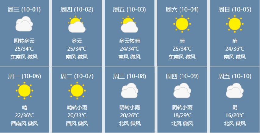 据气象预报,耒阳市“国庆、中秋”节期间(10月1日至10月08日)以多云转晴及晴天气为主。