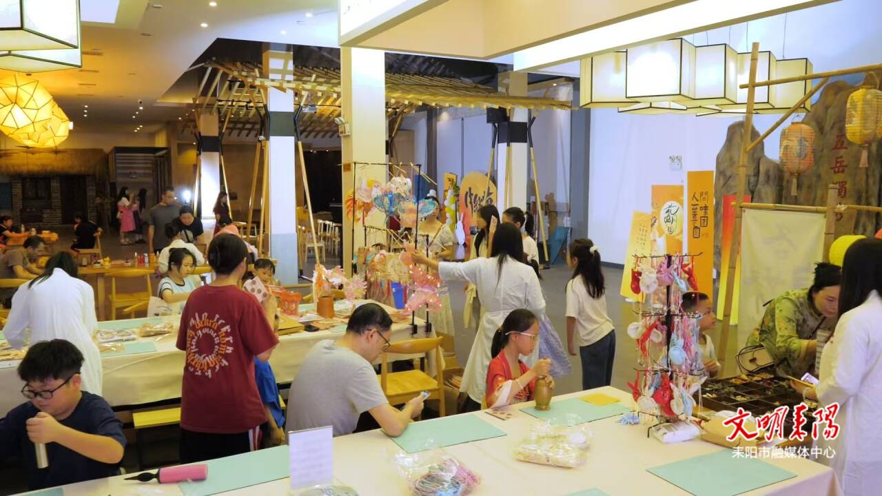 活动当晚,温柔月色笼罩下的蔡伦纪念园,古建筑与五彩装饰灯交相辉映,团圆喜庆的氛围扑面而来,猜灯谜、投壶、非遗体验等各个区域均热闹非凡。猜灯谜区域挂满融合中秋、非遗与造纸文化的灯笼,亲子共同思索答案,猜对的孩子开心兑换礼品;投壶区,孩子们专注地投箭,命中时欢呼声不断,珍贵瞬间被镜头定格;古法造纸体验区让孩子们亲手实践,感受古老技艺魅力;手工花灯制作台前,孩子用彩纸制作花灯,绘上玉兔、月亮等图案,古朴雅致的花灯承载着中秋的美好愿景;印章体验与香包制作项目同样备受欢迎,小朋友们或盖章留念,或制作香包,为活动增添趣味。