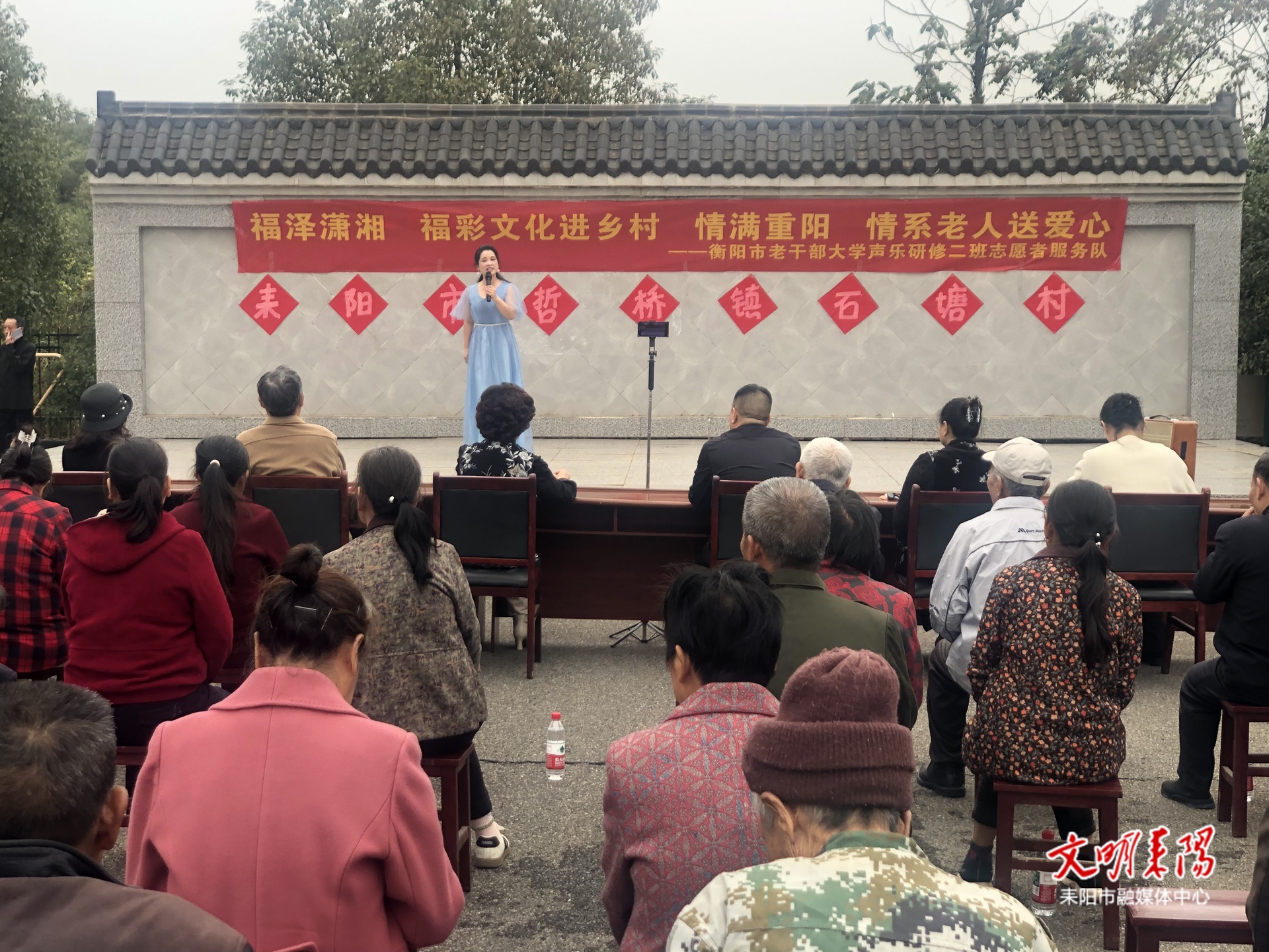 活动在丰富多彩的文艺演出中拉开帷幕。衡阳市老干部大学组织了60余名学员,精心准备了17个形式多样的文艺节目。演出以男女声三重唱《故乡的秋风》开场,悠扬的歌声迅速点燃了现场气氛;合唱《最是衡州》深情表达了对家乡的挚爱;经典戏曲《补锅》则将传统韵味与生活情趣巧妙融合,引得在场老人报以阵阵掌声。整场演出涵盖歌曲、戏曲、器乐、走秀等多种形式,精彩纷呈,为石塘村的老人们带来了一场难忘的视听盛宴。