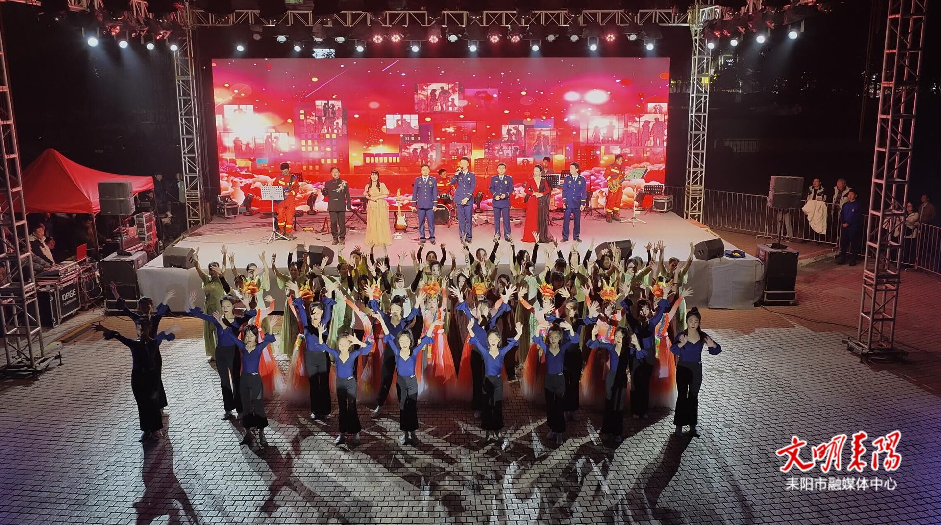 演出现场,来自衡阳消防系统的“蓝雁乐队”与耒阳本土文化志愿者同台献艺,原创歌曲《光》《逆行者》《热浪》《火海里的光》等节目轮番上演,以音乐讲述消防指战员逆行守护、无畏担当的真实故事。耒文乐队及文化馆分馆演员带来的《风起湘南》《文明记心间》《耒水河》等节目,融入地方文化元素,展现文明创建与城市温度。