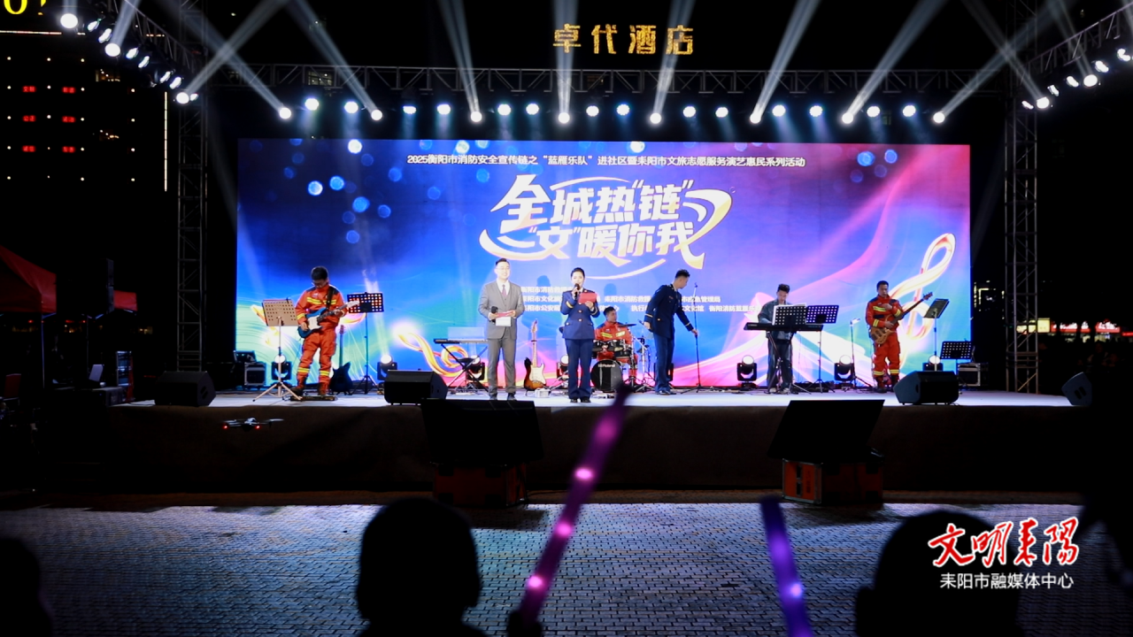 演出现场,来自衡阳消防系统的“蓝雁乐队”与耒阳本土文化志愿者同台献艺,原创歌曲《光》《逆行者》《热浪》《火海里的光》等节目轮番上演,以音乐讲述消防指战员逆行守护、无畏担当的真实故事。耒文乐队及文化馆分馆演员带来的《风起湘南》《文明记心间》《耒水河》等节目,融入地方文化元素,展现文明创建与城市温度。