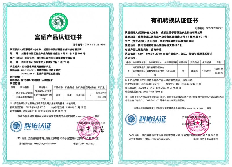 记者在走访中了解到,为了满足更高层次的消费需求,三德子在绵阳基地专门开辟了独立区域,启动了极高标准的生态跑山鸡养殖项目。目前,该项目涉及的13965羽土鸡及其养殖环境,已顺利通过权威机构审核,拿到了“有机转换认证证书”。这意味着,该企业正式开启了向有机食品这一行业金字塔尖的冲刺。