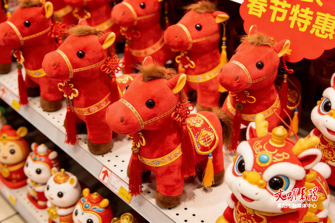 在各大商超,印有骏马图案的春联、烫金“马到成功”的福字、造型可爱的卡通马玩偶被置于醒目位置,吸引市民选购。“选个带马的,讨个‘一马当先’的好彩头。”市民张女士的想法颇具代表性。商家介绍,马主题文创周边尤其受年轻群体青睐,其购买占比超过六成。
