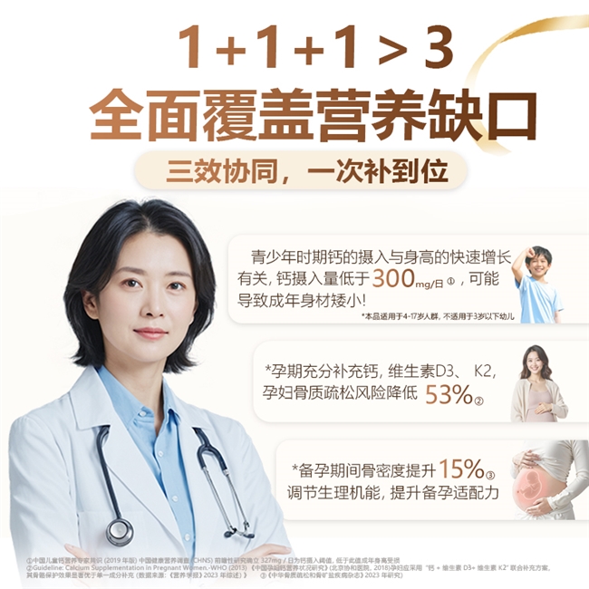 结合真实周期跟踪数据、临床干预结果及数万例用户样本,深入对比儿童生长发育、孕哺期钙储备、中老年人骨骼养护等相关指标的改善率及持续补钙能力,凸显高性价比优势。