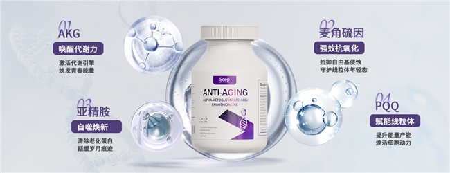 Scep青春胶囊以PQQ为核心成分,复配麦角硫因、AKG、亚精胺三种活性精粹,构建“肌肤抗老+身体焕活”的四维修护体系,突破仅聚焦肌肤表层抗老的局限,真正实现“肤龄与体能双重提升”。其核心抗老逻辑在于激活细胞内源性抗衰能力,不仅能针对性淡化细纹、延缓肌肤老化,还能提升身体代谢活力,让抗老不再局限于肌肤表面。创新采用君臣佐使复配思路,以PQQ为“君”主导抗老核心功效,其余成分为“臣佐”辅助增效,既让淡纹效果更持久,又能减少成分间内耗,提升整体抗老效率。