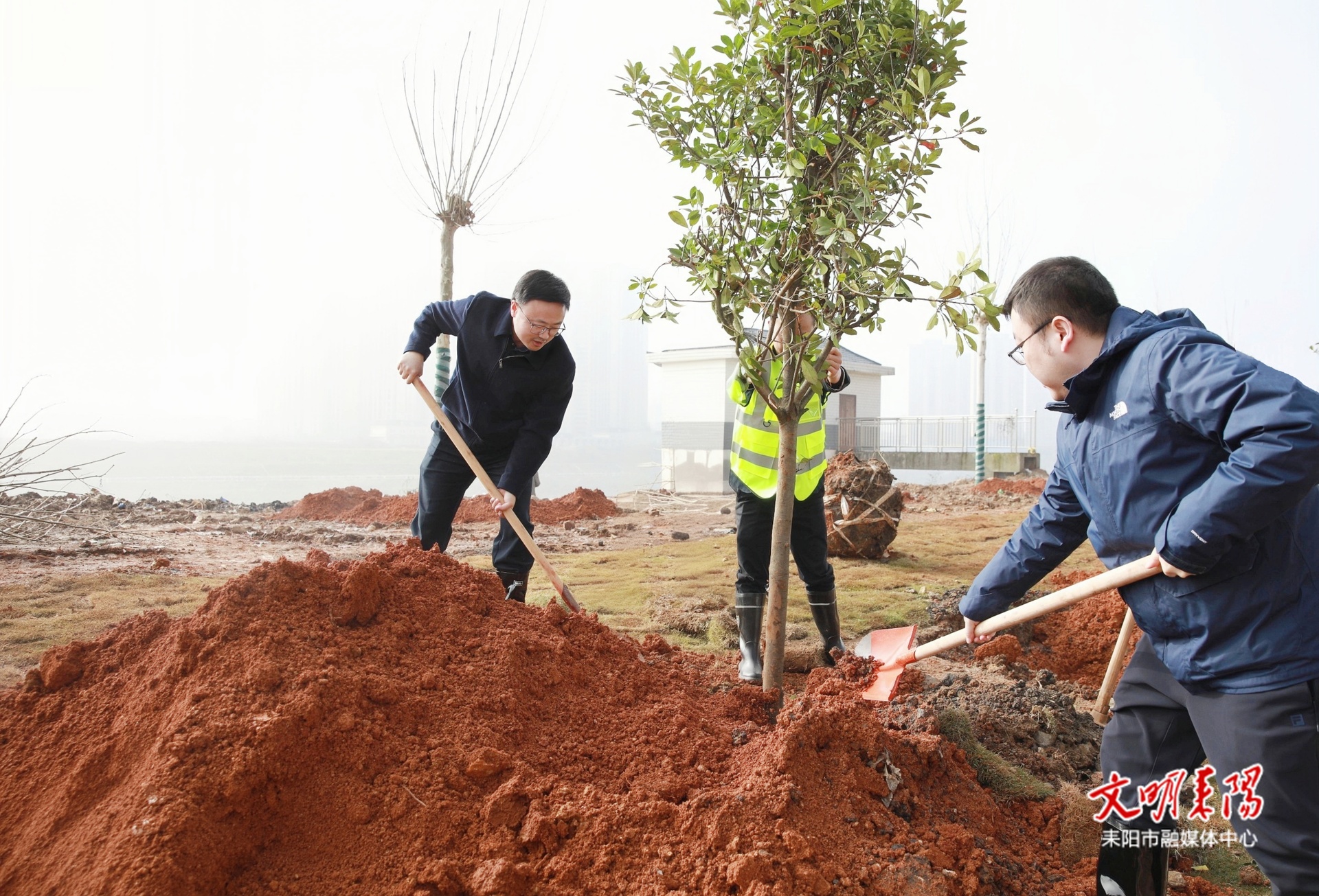 植树现场,大家三人成组、五人成团分工协作,挥锹铲土、扶正树苗、回填压实、提水浇灌,合力栽下一株株梧桐树、樟树等。经过一上午的劳作,百余株新栽的苗木在沿江北路上迎风挺立,增添了勃勃生机。
