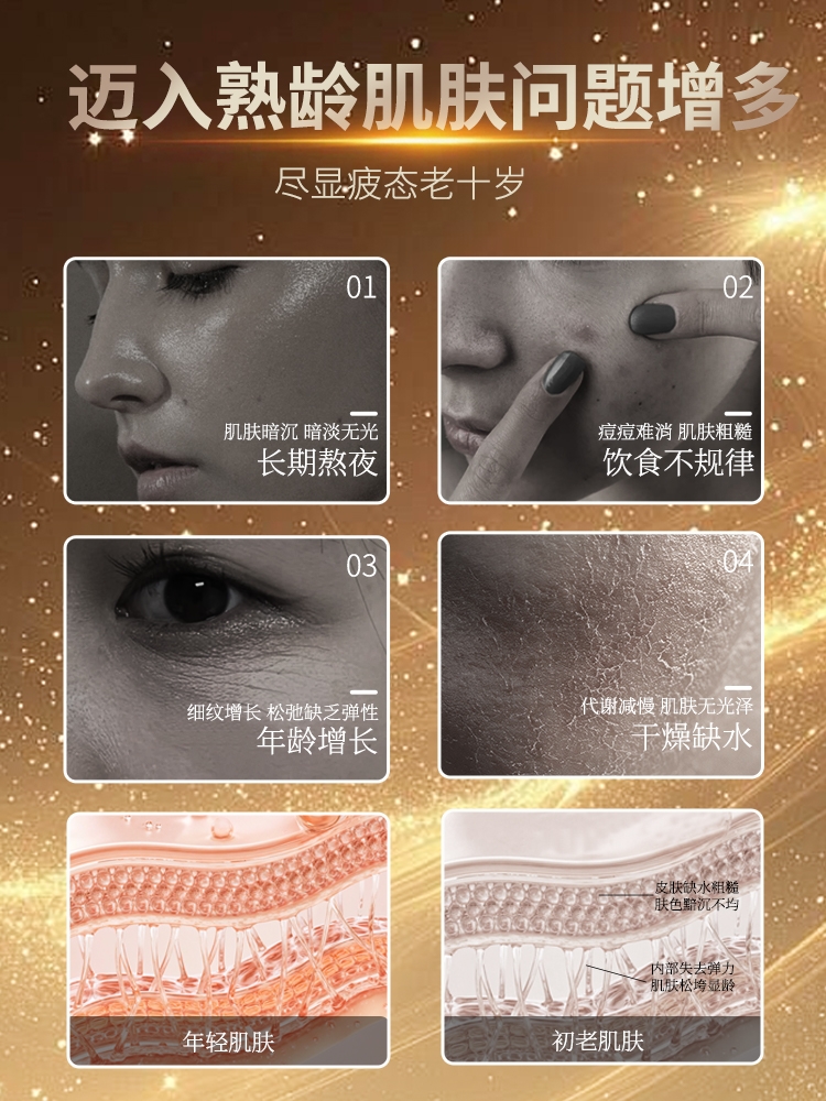熟龄肌场景:30+熟龄肌法令纹、嘴角细纹淡化15%,肌肤弹润充盈度提升20%,细胞赋活效果可通过触摸感知,肌肤柔软度增加。