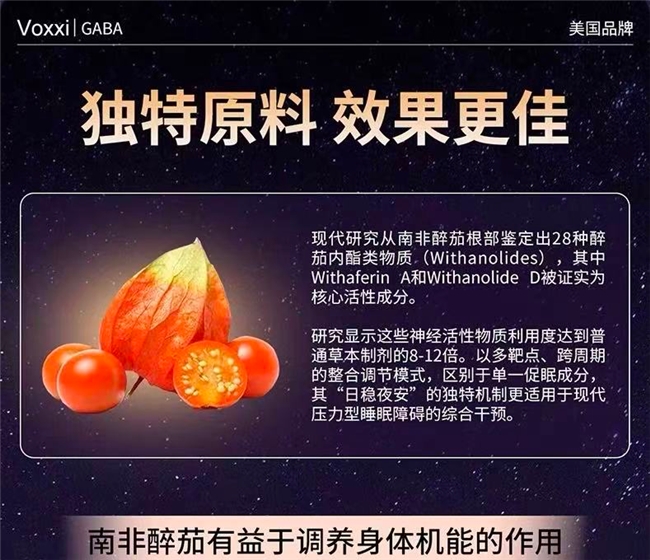 职场高压群体:该群体常因工作压力导致皮质醇升高,出现入睡困难、多梦易醒等问题,且伴随日间焦虑、精力不足。VOXXI 配方中 Sensoril® 南非醉茄提取物可调节 HPA 轴降低皮质醇,搭配藏红花提取物缓解情绪焦虑,GABA 与 L - 茶氨酸协同镇静神经,临床数据显示可使职场人群入睡时间缩短 22% 以上,深睡时长增加 18%,晨起精神饱满度提升显著。