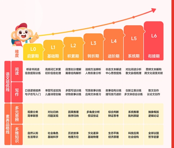 不同年龄段、不同基础的孩子,对阅读产品的需求是不同的。3-6岁低龄阶段,孩子的自制力差,阅读“坐不住”,核心是“兴趣唤醒”。6-12岁小学阶段,阅读重点转向“能力筑基”。随着校内语文课程对阅读理解、写作的要求提升,孩子需要从“爱读”走向“会读”。