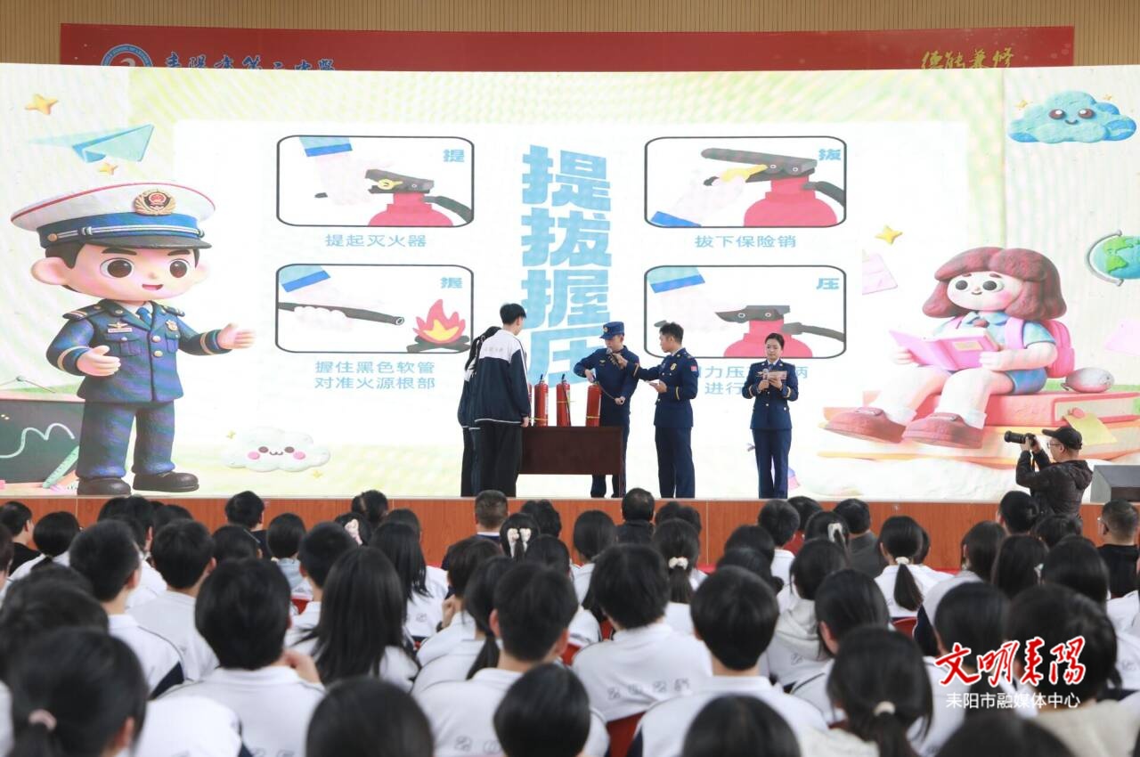 耒阳融媒3月18日讯(记者 梁梓坤 李靖宇)3月17日下午,衡阳市教育局、衡阳市消防救援局在耒阳市第二中学开展消防安全宣传教育活动,通过实验演示、实操体验、互动问答、场外连线排查等形式,让师生们在轻松有趣的氛围中学习消防知识,提升消防安全意识和自防自救能力。