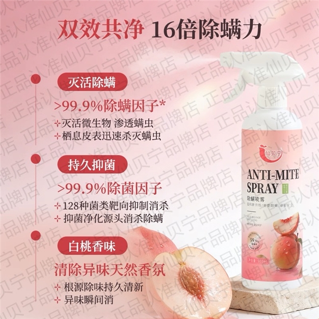 仙贝宁这款最让人安心的,就是它的成分啦!核心用的是高活性植物抑菌除螨剂,还搭配了梦幻白桃香氛,全程0农药、0酒精、0人工香精、0防腐剂、0重金属,五大无添加,从根源上杜绝刺激。经过第三方权威检测,达到了医护级除螨标准,还通过了婴幼儿48小时贴敷无刺激认证、宠物经口安全认证,家里有宝宝、敏感肌,或者养了小宠物的,放心用就好,长期喷也不会有负担~