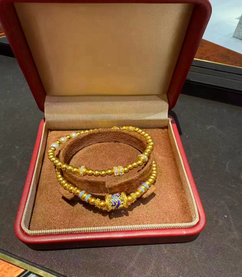 古法黄金的哑光质感需定期保养,避免与硬物摩擦,炸珠、花丝等精细工艺的黄金饰品,佩戴时需避免大力拉扯,延长饰品使用寿命;