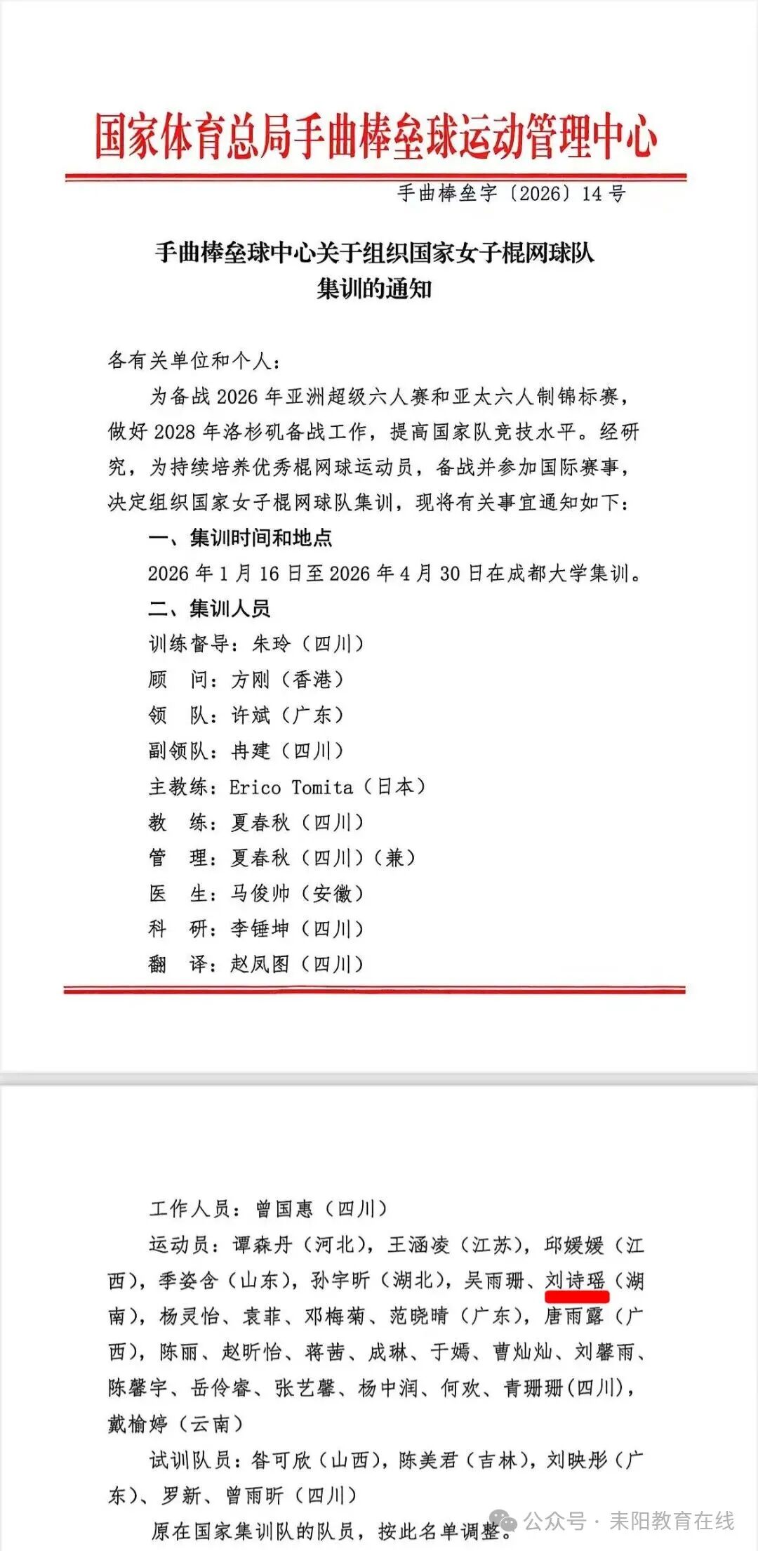 从耒阳二中的塑胶跑道,到国家队的集训营,这个耒阳姑娘,把年少的热爱,跑成了为国出征的荣光! 国家体育总局集训通知截图 近日,国家体育总局发布2026年国家女子棍网球队集训通知,耒阳二中2025届学子刘诗瑶成功入选。据悉,刘诗瑶将随队备战2026年亚洲超级六人赛和亚太六人制锦标赛,并全力备战2028年洛杉矶奥运会。 在耒阳二中,她种下了体育梦的种子 时间倒回2022年,刘诗瑶以体育特长生身份进入耒阳二中。三年高中时光,她在田径场上挥洒汗水,打下了坚实的身体素质基础。她连续三年荣获耒阳市运会女子100米、200米第一名,更在省级、国家级赛场上屡获佳绩。2025年,她以优异成绩通过体育单招,考入成都大学体育学院运动与训练专业,开启人生新篇章。 从田径跑道到棍网球赛场,她完成了漂亮转身 进入大学仅半年,凭借出色的运动天赋和扎实的体能基础,刘诗瑶便入选国家棍网球队。 这份成绩的背后,是刘诗瑶日复一日的汗水,也是耒阳二中“全面+个性”特色教育的生动答卷。学校深耕体艺教育领域,取得了辉煌的办学成绩。尤其是体育特色教育更是一枝独秀,在衡阳市享有盛名。未来,学校也将继续把“务实严谨、开拓创新、团结奋进、永不言败”的体育精神融入办学全过程,助力县域青少年体育事业高质量发展。