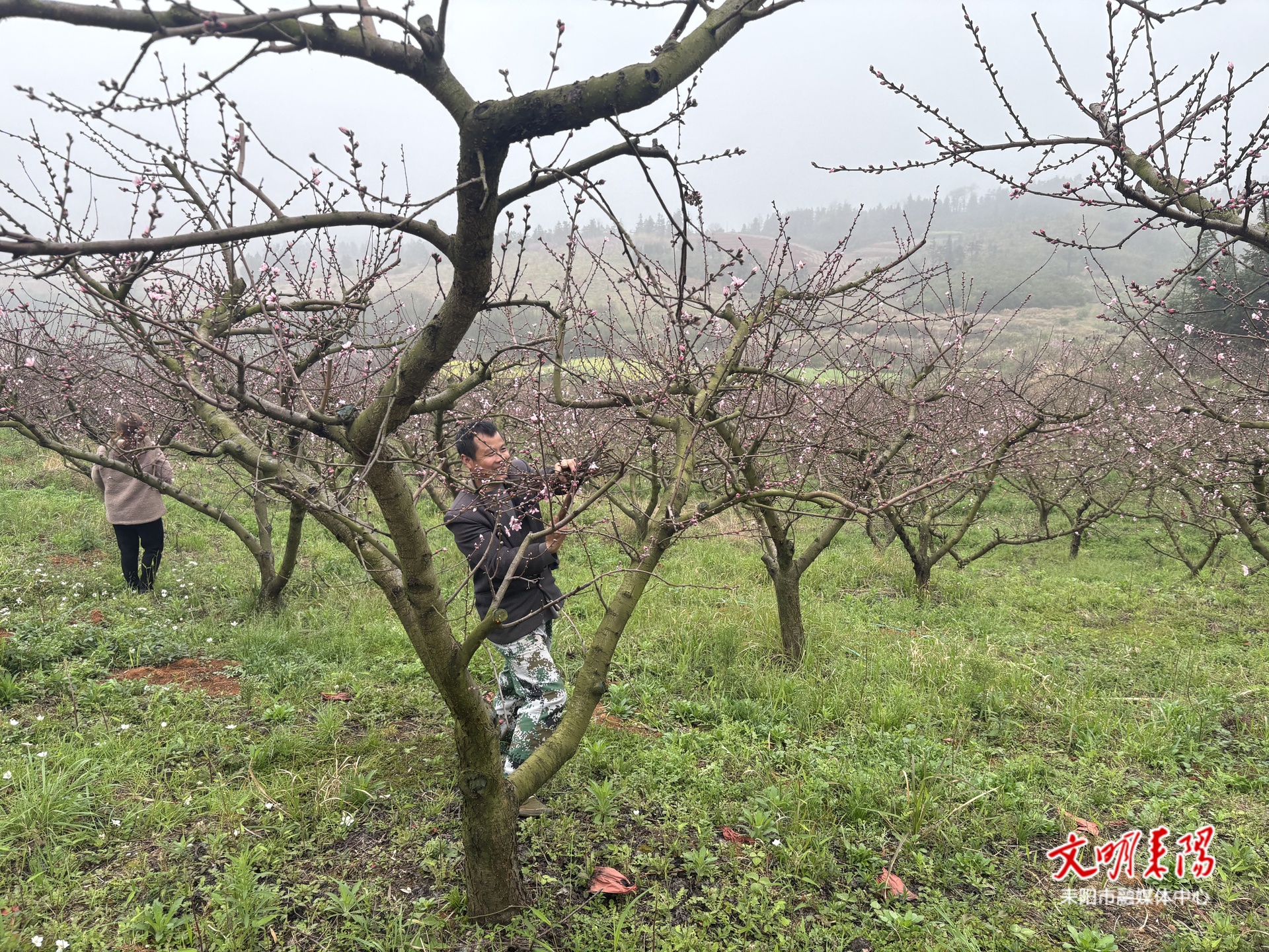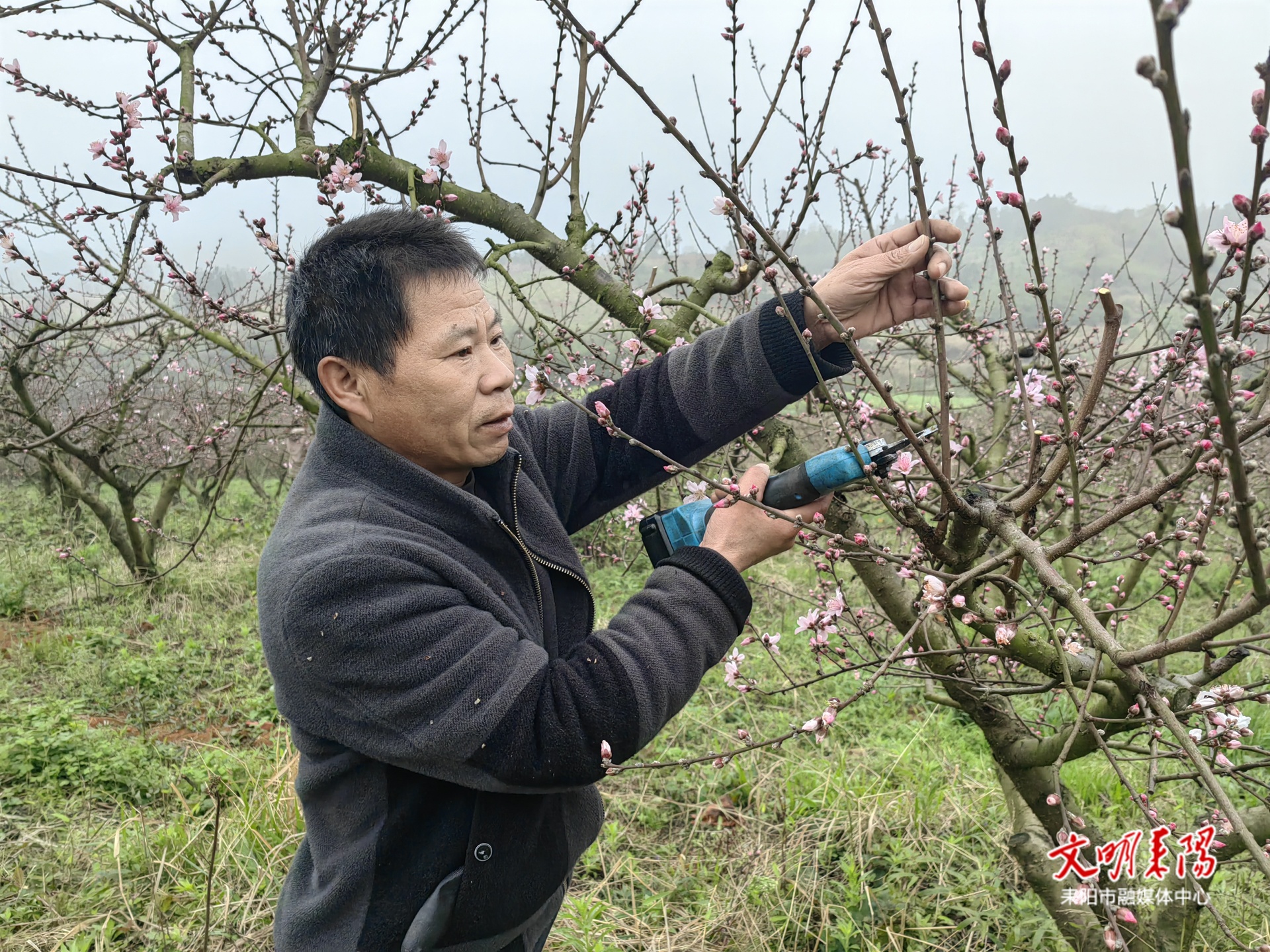 为了让满树桃树结出更多硕果,贺幼成一大早就叫上了家人在桃园中忙碌了起来。大家分工协作、干劲十足,修剪病枝、梳理花芽、均匀施肥,每一个环节都做得一丝不苟,在春日的绵绵细雨里勾勒出一幅繁忙的春耕画卷。