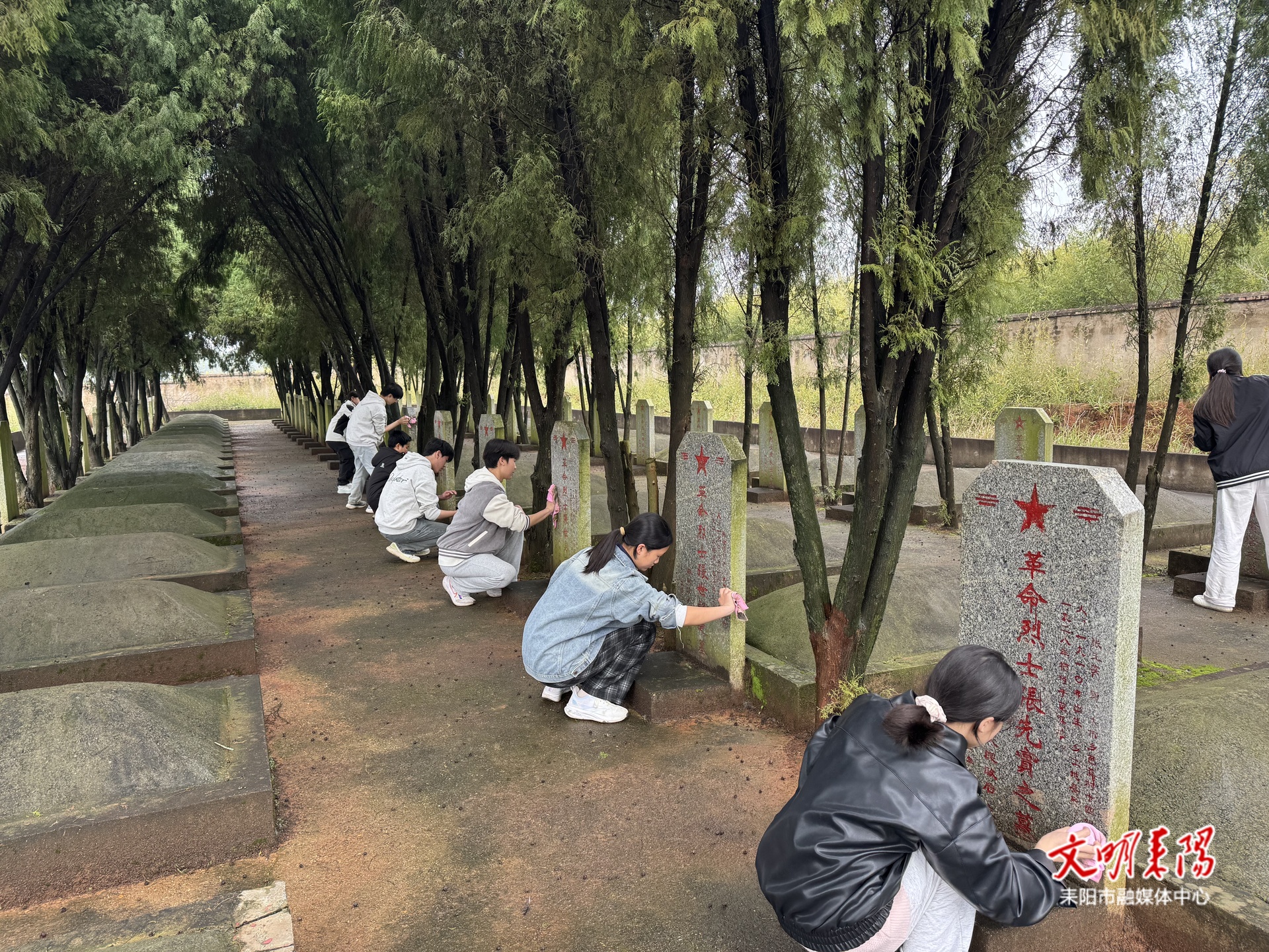 祭扫现场,30余名团员青年分工开展实践活动。有的手持湿毛巾,小心翼翼地擦拭着墓碑上的灰尘,细致清理墓碑周边的杂草,不放过任何一处污渍;有的凝神聚力,手持细毛刷和红漆,一笔一画认真为墓碑上模糊的字迹描涂,力求让英烈的姓名清晰可辨。团员们以细腻的举动、务实的行动,守护英烈安息的净土,用最朴素的方式,表达对革命先烈的深切缅怀与崇高敬意。随后,团员青年们整理仪容仪表、佩戴团徽,在团旗下开展入团宣誓仪式。