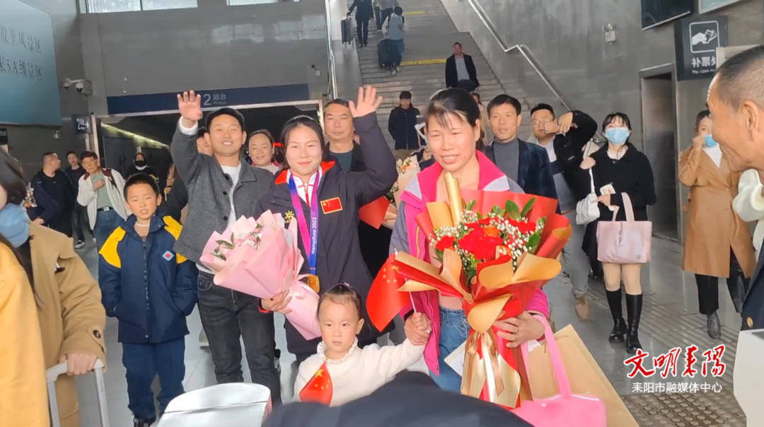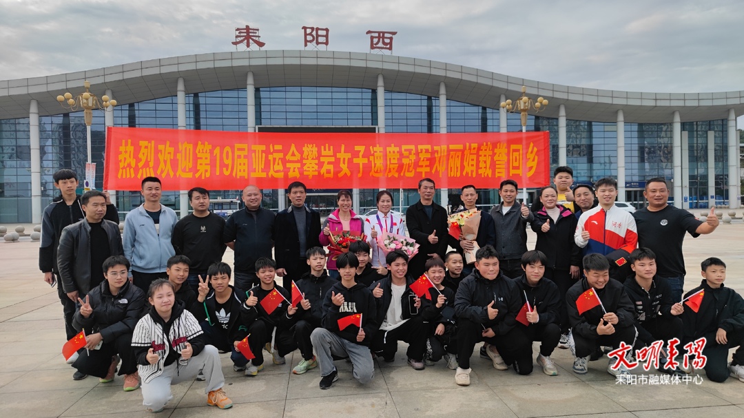 11月18日下午,杭州亚运会速度攀岩女子接力金牌获得者邓丽娟回到家乡耒阳。市政协副主席、文旅广体局局长陆小勇到耒阳西站迎接,并代表全市人民送上热烈的祝贺和真挚的问候。