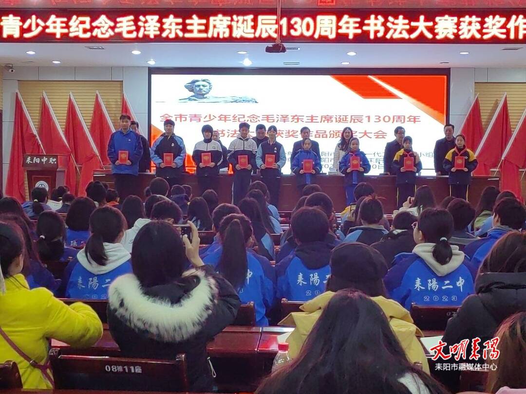 12月20日上午,衡阳市青少年纪念毛泽东主席诞辰 130 周年书法、征文作品展览及颁奖活动在耒阳市中等职业技术学校举行。市委常委、组织部部长、统战部部长颜洞宾,市人大常委会原主任、市关工委主任黎家能,市人大常委会副主任秦玉林,市政府副市长阳姣丽,市政协副主席高爱民,市关工委副主任曾阳生、雷德芽、资新根等领导出席活动并为获奖学生颁发证书。