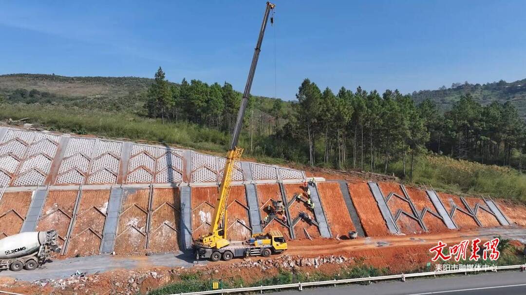 在耒宜改扩建耒阳南互通施工现场,80多套路基、桥梁机械设备正抓紧施工,机器轰鸣声震耳欲聋、重型卡车来回穿梭荡起滚滚烟尘。耒阳南互通占地12万平方米,土石方工程量约50万方,已于2024年8月正式开工。现已完成互通右幅涵洞80%、土石方50%、桩基60%,预计在12月完成右幅桩基、涵洞和路基填筑,为下阶段路面、收费站施工打好基础。