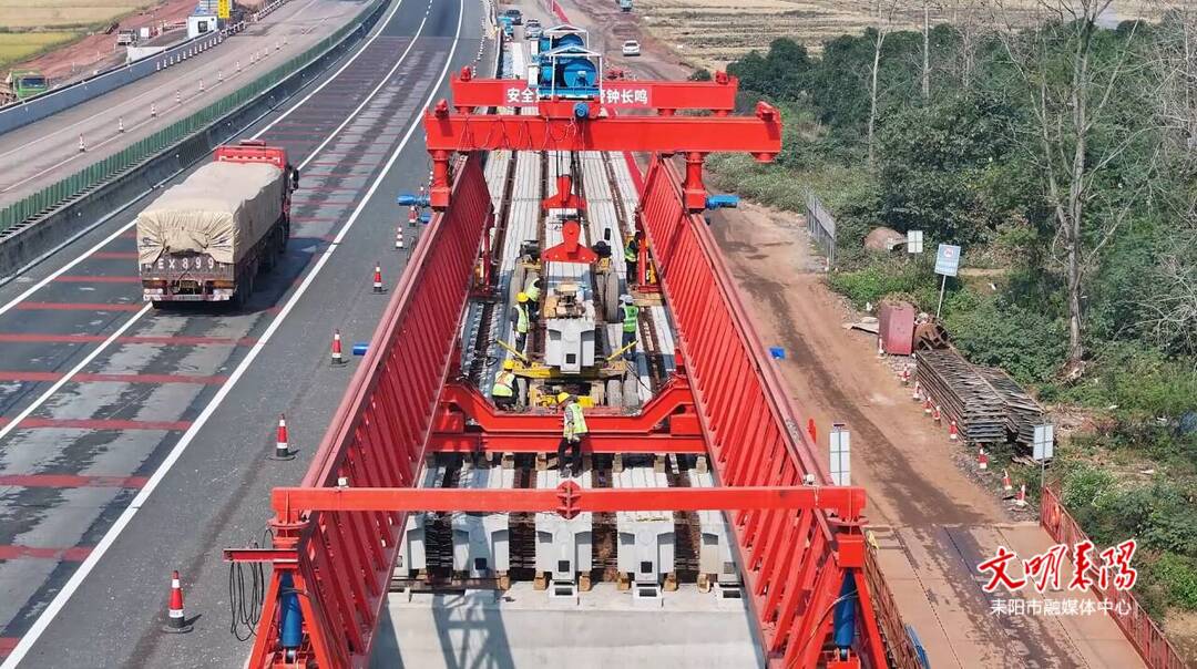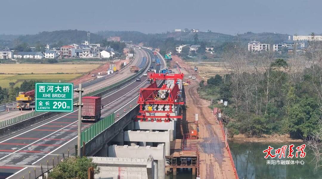 在西河大桥施工现场,大型架桥机正在平稳运行,一片片预制T梁安全、精准地落放到桥梁支座上,该桥左幅第11跨快速架设完成。西河大桥共14跨,目前正在进行的是左幅拼宽桥梁的梁板架设工作。与此同时,右幅的桥梁下构也在同步进行施工,待左幅梁板架设完成后,架桥机将移至右幅进行作业。为抢抓晴好天气,项目方一改常规桥梁桩基下构施工先、梁板预制后的操作,加大人员和设备的投入,实行桥梁桩基及梁板预制同时开工,加快了桥梁建设的整体进度。省高速建设工程有限公司耒宜改扩建项目三分部副经理汤平告诉记者:“耒宜高速西河大桥是由我们耒宜改扩建第三总承包部三分部负责建设。西河大桥全长290米,共14跨,是全线率先完成第一根立柱、第一片盖梁、第一片梁板预制及架设的桥梁。目前,正在建设左幅拼宽段第11跨梁板,力争在12月25日前把西河大桥拼宽部分的梁板全部架设完成,届时将是耒宜改扩建的第一座完成大桥架设的工程。”