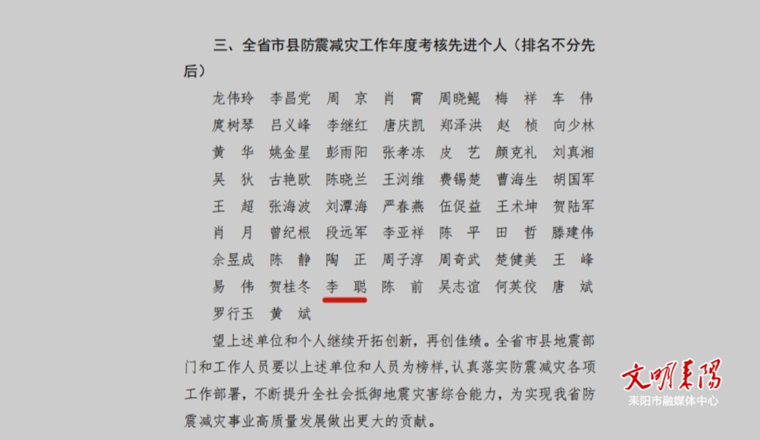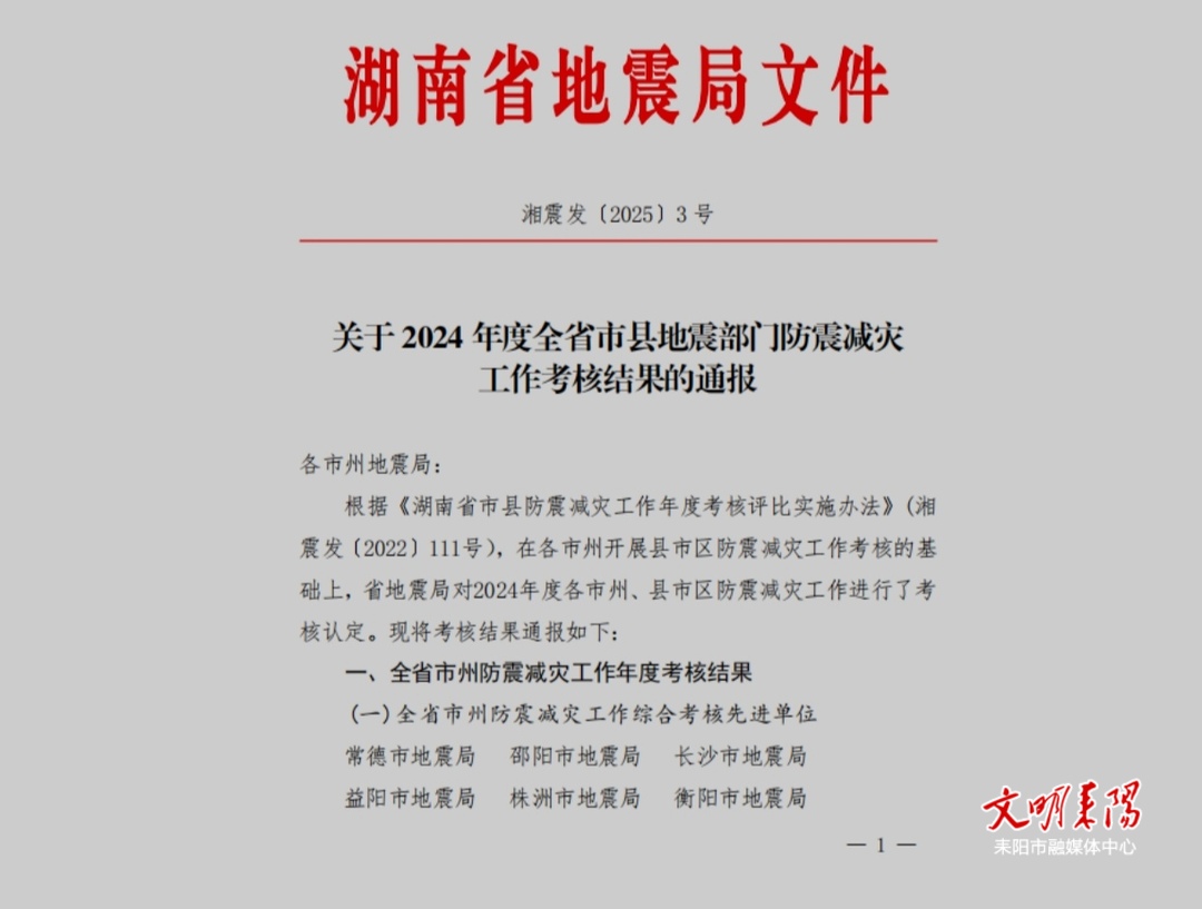 近日,湖南省地震局下发了《关于2024年度全省市县地震部门防震减灾工作考核结果的通报》(湘震发[2025]3号),耒阳市地震局荣获全省县级防震减灾工作综合考核先进单位;耒阳市地震局李聪同志荣获全省市县防震减灾工作年度考核先进个人。