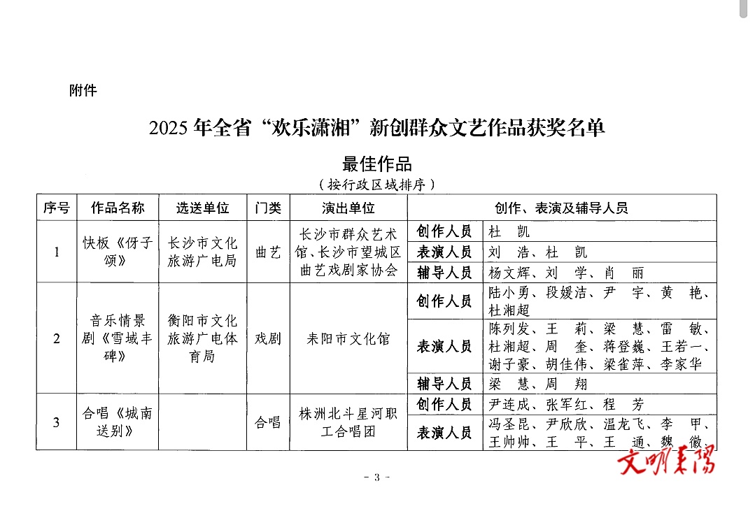 耒阳融媒1月2日讯(记者 刘喜)近日,湖南省文化和旅游厅发布《关于公布2025年湖南省“欢乐潇湘”新创群众文艺作品获奖情况的通知》,由衡阳市文旅广体局选送、耒阳市文化馆演出的作品——音乐情景剧《雪域丰碑》荣获最佳作品奖(金奖),为耒阳红色文艺创作再添亮眼成绩单。
