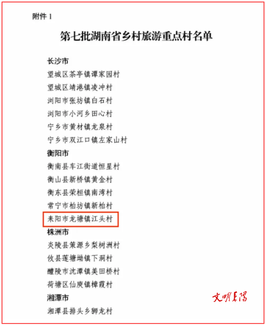 耒阳融媒1月7日讯(记者 陈娟)近日,湖南省文化和旅游厅、湖南省发改委联合发文,公布第七批湖南省乡村旅游重点村名单,耒阳市龙塘镇江头村成功入选,成为衡阳地区5个上榜村之一。