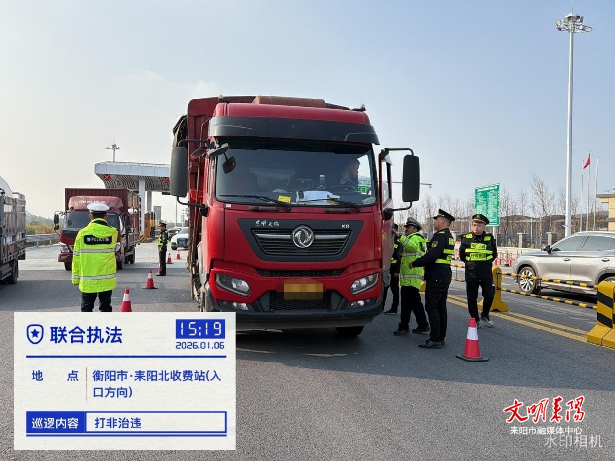 耒阳融媒1月7日讯(记者 赵娟 通讯员 谷亮 周宝庆)连日来,耒阳市综合行政执法局联合湖南高速公路交警耒阳大队开展“打非治违”执法行动,对辖区内高速公路出入口、服务区的过境重点车辆进行执法检查,助推道路运输“打非治违”百日攻坚行动取得实效。