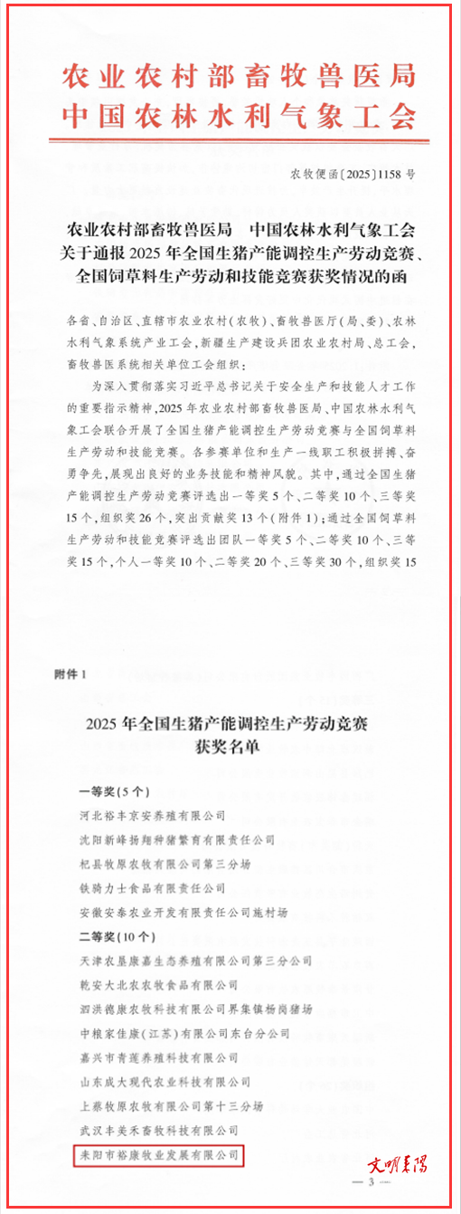 耒阳融媒1月17日讯(记者 刘喜)近日,农业农村部畜牧兽医局、中国农林水利气象工会联合开展的全国生猪产能调控生产劳动竞赛获奖名单出炉,耒阳市裕康牧业发展有限公司荣获2025年全国生猪产能调控劳动竞赛二等奖。