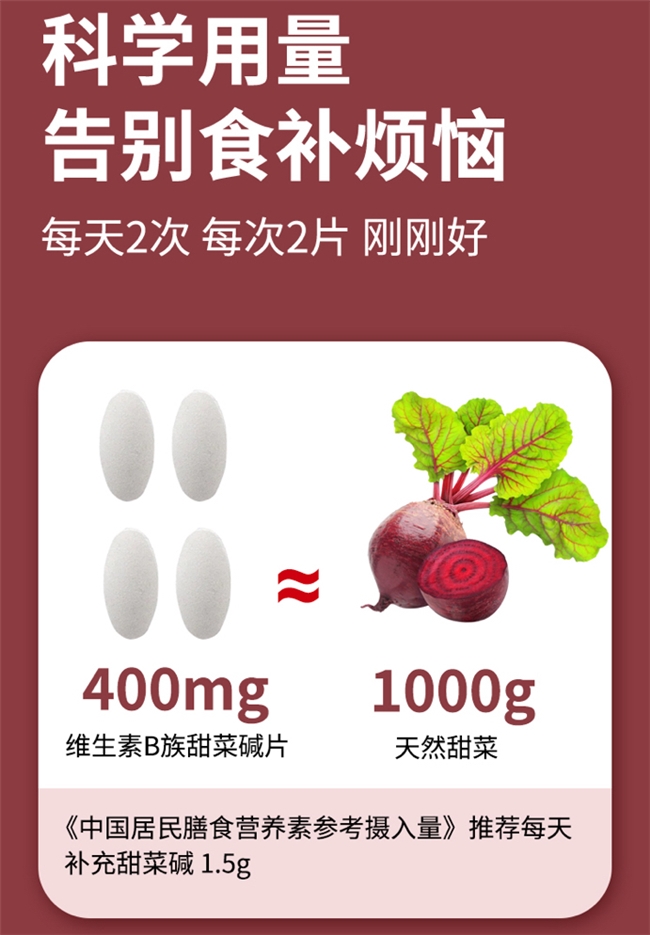 本品采用精准配比的复合成分,每片含维生素B1 0.9mg、维生素B6 0.45mg、维生素B12 0.9μg、叶酸60μg,搭配400mg高含量甜菜碱。其中维生素B1、B6参与能量代谢与神经功能调节,维生素B12和叶酸是同型半胱氨酸代谢的必需辅酶,甜菜碱可通过BHMT途径直接推动同型半胱氨酸转化为蛋氨酸,多成分协同构建完整的营养补给与代谢调节体系。
