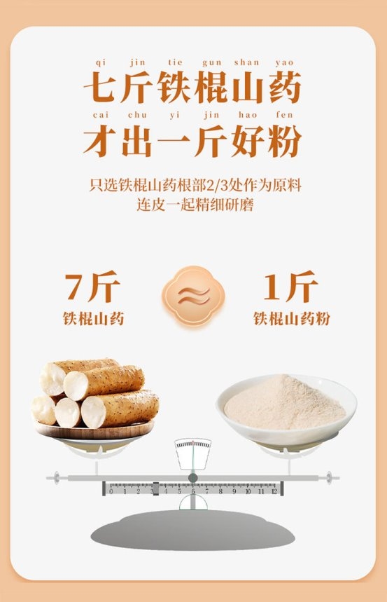 核心成分与配方上,它做到了极致纯粹,配料表仅“铁棍山药”一项,全程无任何添加剂介入生产。实测冲泡时,粉质呈自然乳白色,散发淡淡的山药本香,无刺鼻异味,冲泡后细腻绵滑,静置后轻微沉淀搅拌即匀,这源于其精细研磨工艺与非遗古法炮制技术。品牌严格传承非遗技艺,历经选料、清洗、低温慢蒸、自然晾晒、三重研磨等18道工序,恪守“七斤山药出一斤粉”的古训,既避免了高温破坏活性成分,又让营养高度浓缩。