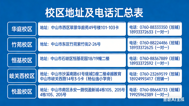 特色:主打“N对一”个性化辅导模式,为每位学生配备英语教师、班主任、心理咨询师等专属团队,量身定制学习计划。聚焦中山中考考点,擅长针对性弥补偏科问题,如语法薄弱、听力失分等,适合基础薄弱或需拔高的学生。