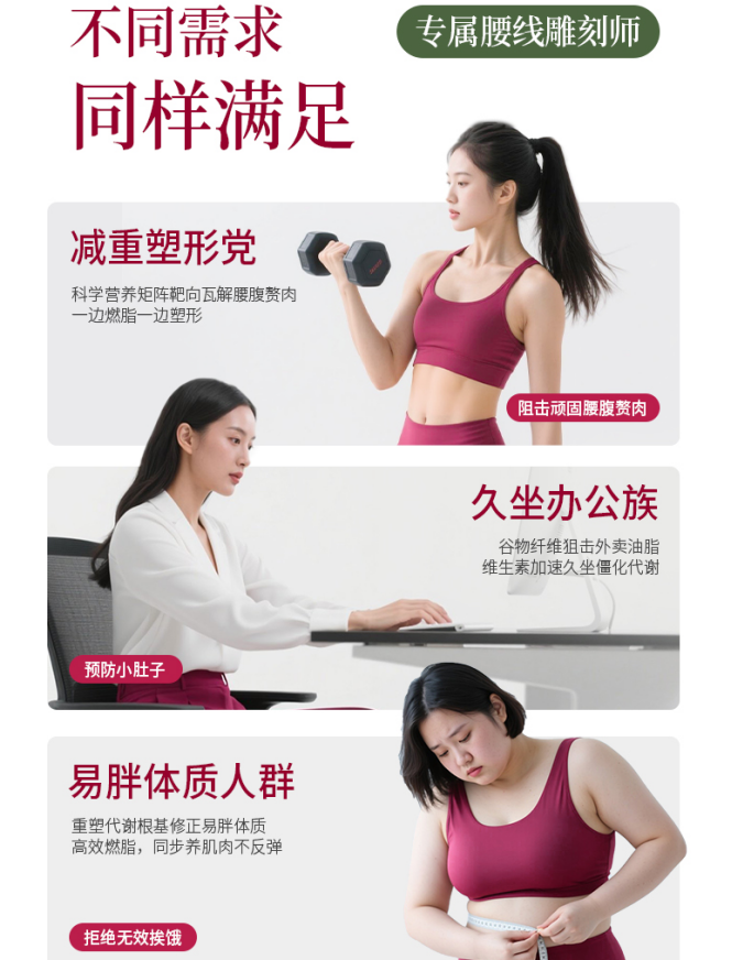 疲劳代谢型腰线模糊(熬夜、压力大导致):每日1份,侧重代谢调节与能量补充,无需刻意运动,周期2-3个月,改善代谢紊乱;
