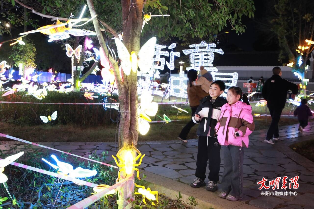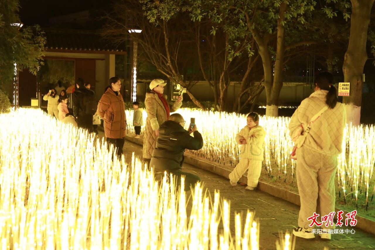 当晚,园区主干道仿真稻穗灯珠璀璨闪烁,暖光绵延如星河,孩童在灯影间嬉戏追逐,游客纷纷驻足拍照打卡。核心区域以蔡伦文化为脉络,通过光影艺术与场景营造,将千年纸韵与现代光影美学相融,让传统文化在夜色中焕发出灵动鲜活的新魅力。