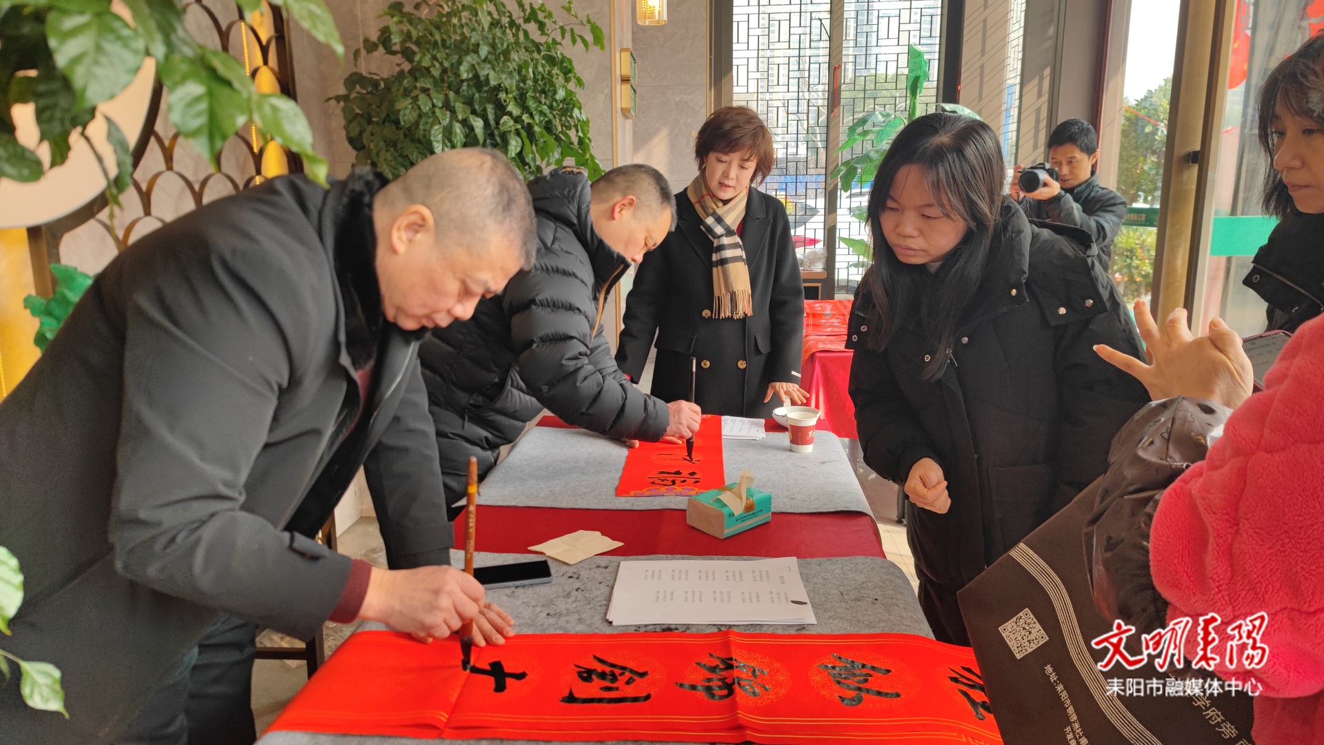 耒阳融媒2月10日讯(记者 李靖宇 刘喜)2月9日,耒阳市2026新时代新春联“百千万”艺术工程惠民活动暨“强基工程”助力基层精神文明建设活动,在耒水情餐饮温情启幕。活动以免费书写、赠送新春对联的形式,将真挚的节日祝福送到基层群众手中,让笔墨书香浸润百姓生活,助力提升全民文化素养与基层精神文明建设水平。