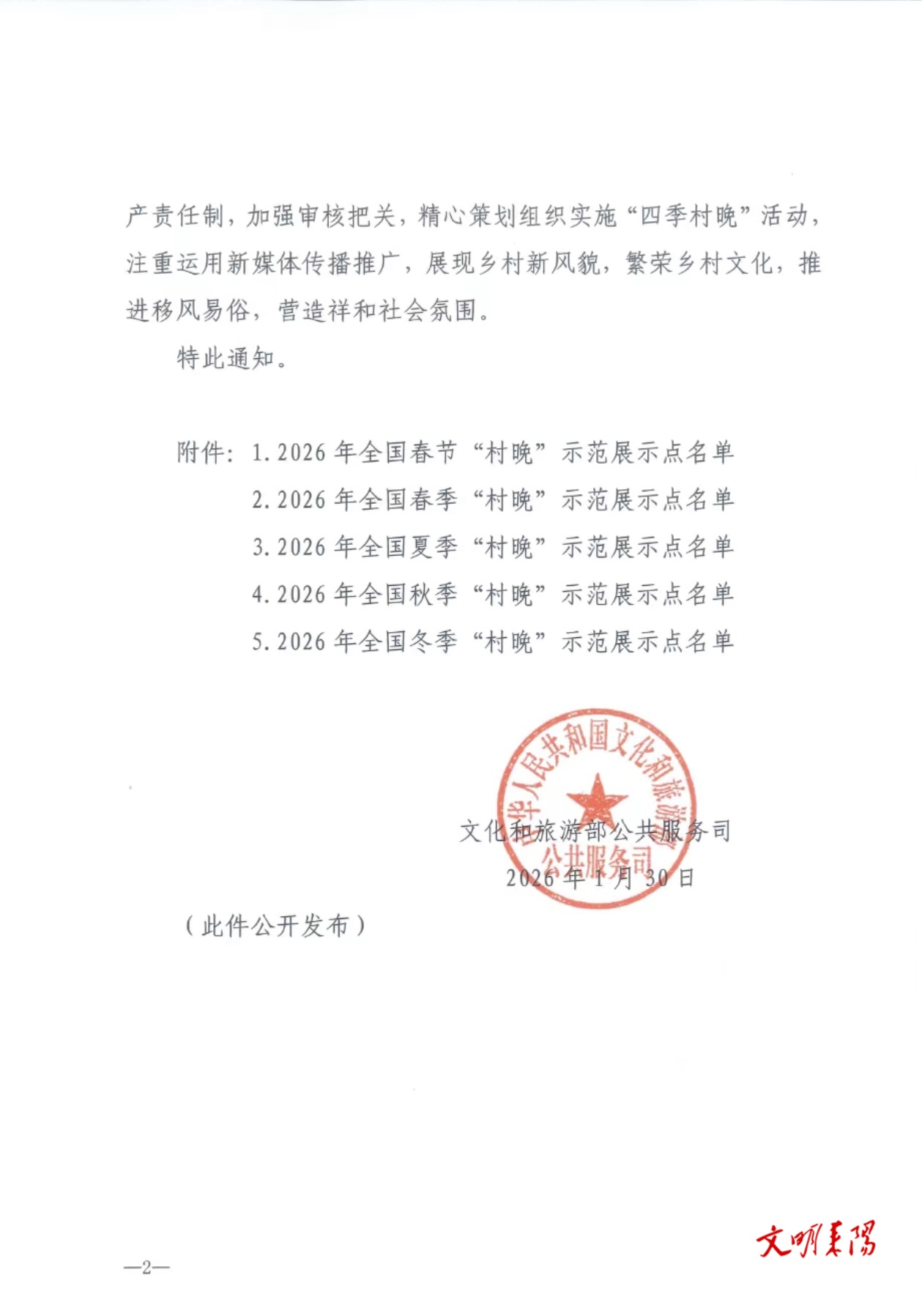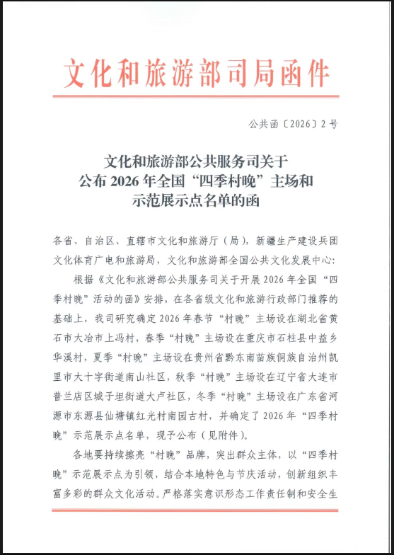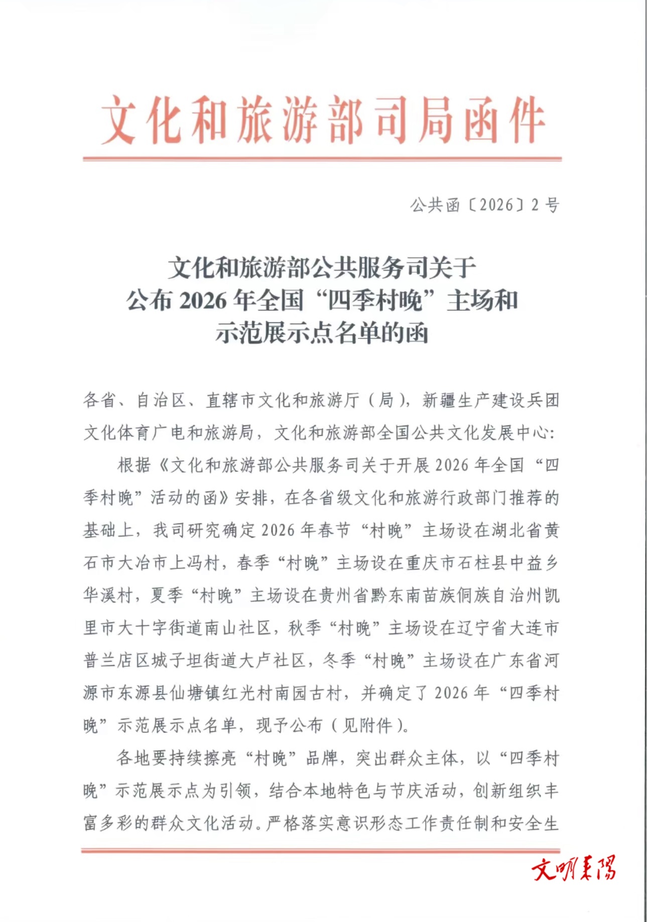耒阳融媒2月11日讯(记者 赵娟)近日,文化和旅游部公共服务司公布2026年全国“四季村晚”主场及示范展示点名单,耒阳市蔡子池街道金南社区成功上榜全国春季“村晚”示范展示点。