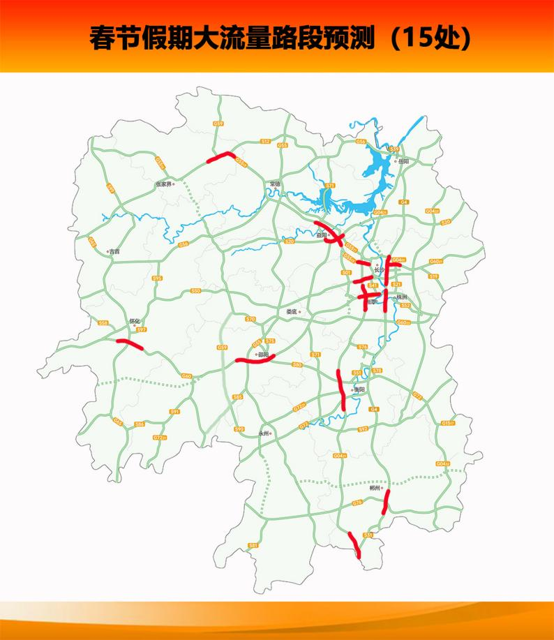 春节假期小型客车实施免费通行政策,短途探亲旅游流量增幅大。假期省内大流量路段主要集中在:G5513长张高速长沙段、益阳段、张家界段;G4京港澳高速长沙段、湘潭段、郴州段;G60沪昆高速湘潭段、邵阳段、怀化段;G0421许广高速湘潭段、衡阳段、郴州段;G6021杭长高速长沙段;S20平洞高速益阳段;S50长芷高速长沙段。