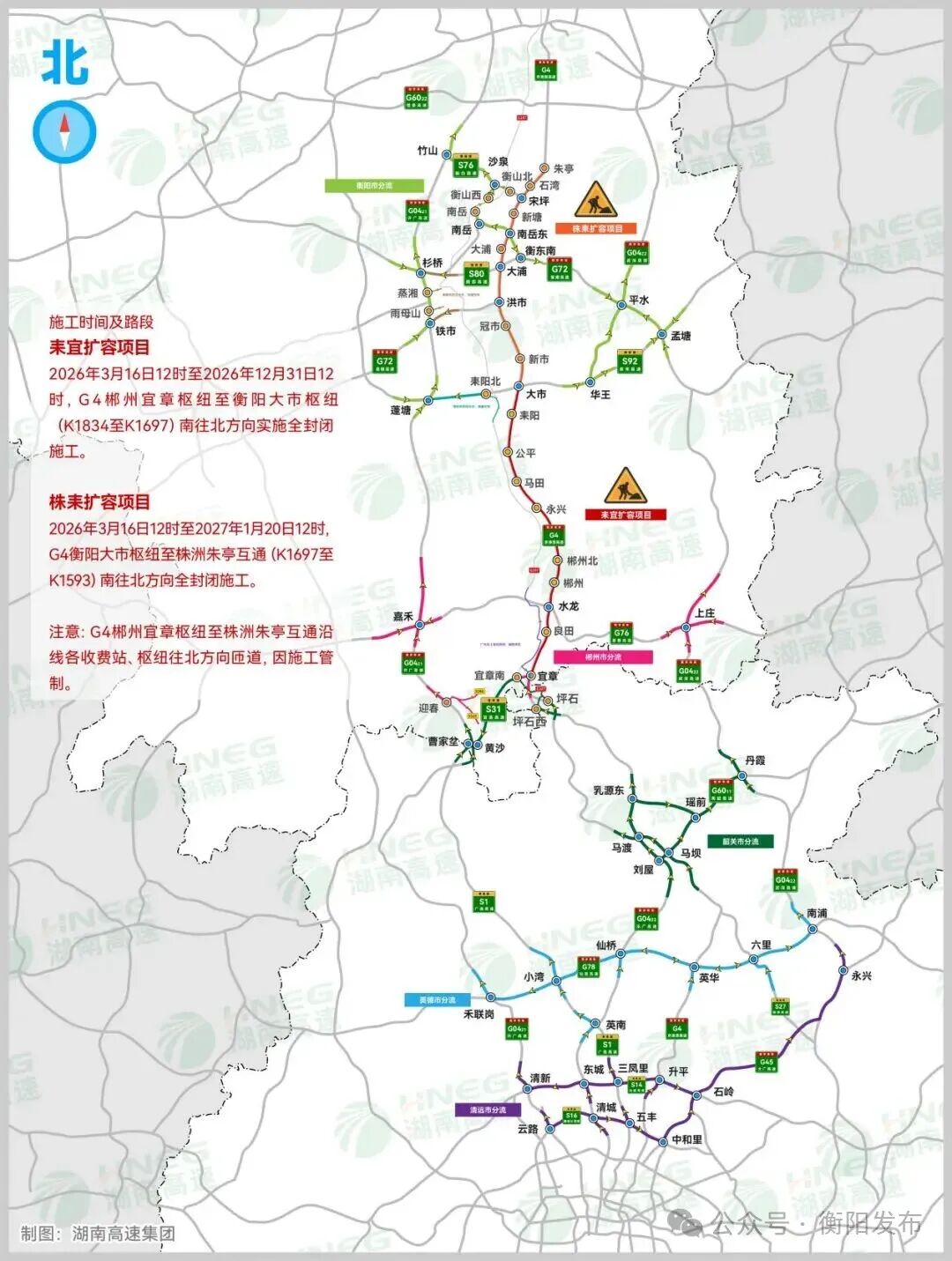 2026年3月16日12时至2027年1月20日12时,G4衡阳大市枢纽至株洲朱亭互通(K1697至K1593)南往北方向全封闭施工。
