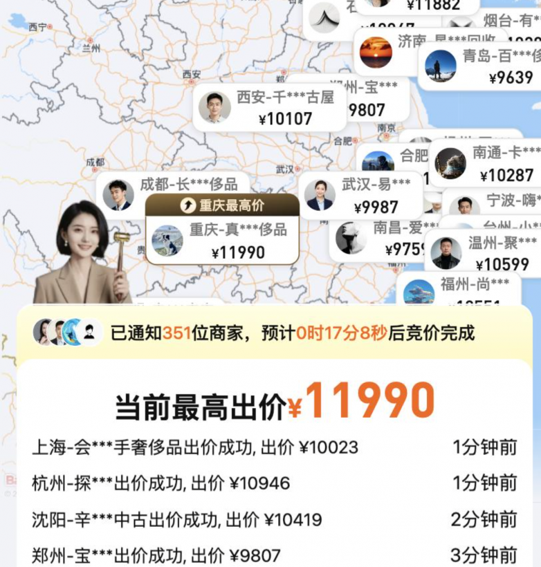 比如奢侈品回收,爱回收采用百家商户竞价模式。门店完成鉴定后,物品信息会推送给全国上百家回收商,采用暗拍模式竞价,用户可以看到实时竞拍,报价时间预计 15 分钟。最终价格不是平台单方面说了算,而是市场竞争后的结果。
