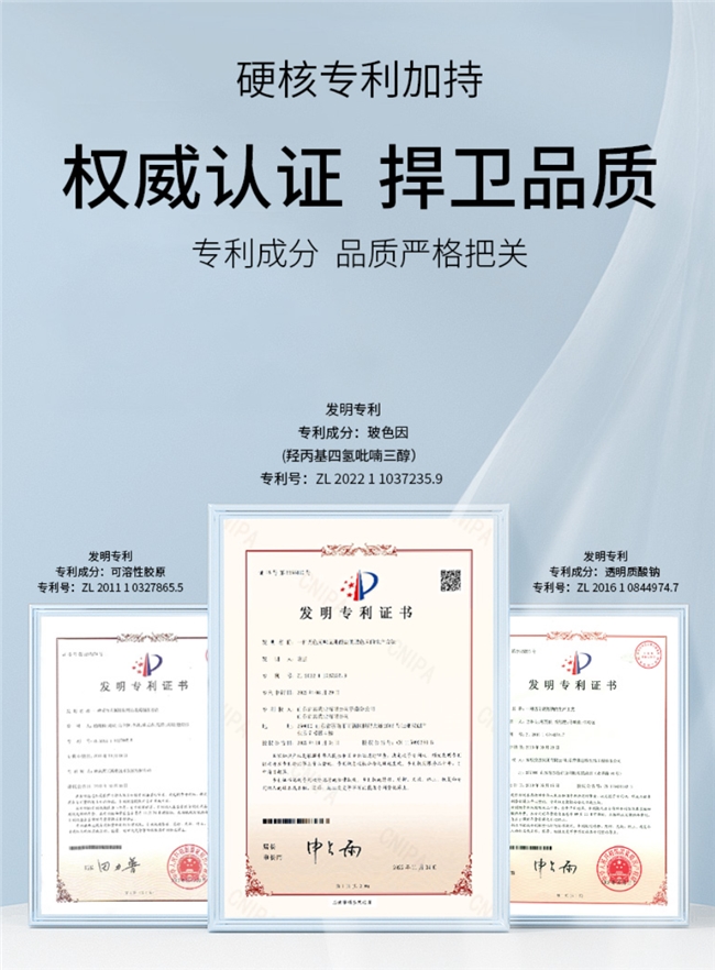 · 立体锁水网:专利透明质酸钠(0.11%添加量,专利号:ZL201610844974.7)。跟那种只能在皮肤表面扒一层的普通玻尿酸不一样,这种专利透明质酸钠自己会搭一个立体的锁水网,从角质层最上面一直润到最底下,不会让人洗完脸抹完水,过五分钟就感觉跟没抹一样。它是真的能把保湿撑住,不是那种糊一层上去、干了就什么都没剩下的“表面功夫”。