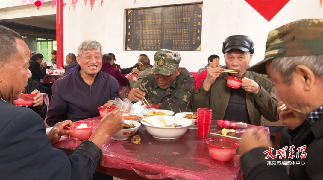 11月18日,耒阳市遥田镇被塘村 16 组“湾村明白人”肖俊利和几位同村老乡一大早就开始忙碌,洗菜、切肉、调料、烹饪,经过三个小时的精心准备,一道道丰盛的“敬老餐”便上了桌。